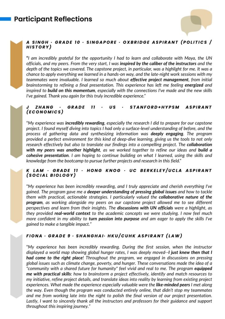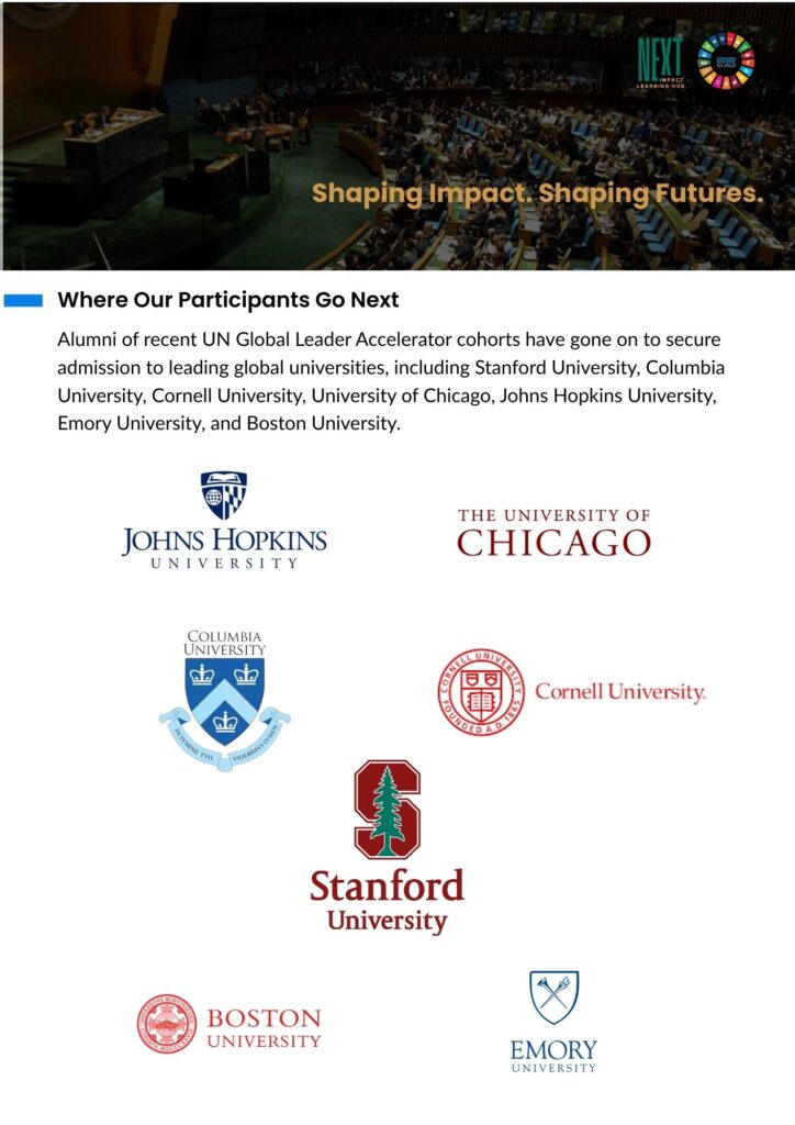Alumni of recent UN Global Leader Accelerator cohorts have gone on to secure admission to leading global universities, including Stanford UniversityColumbia UniversityCornell UniversityUniversity of ChicagoJohns Hopkins UniversityEmory University, and Boston University.