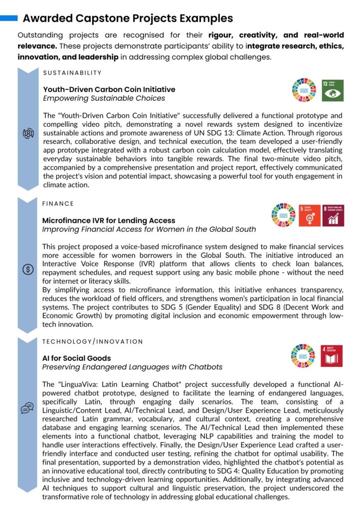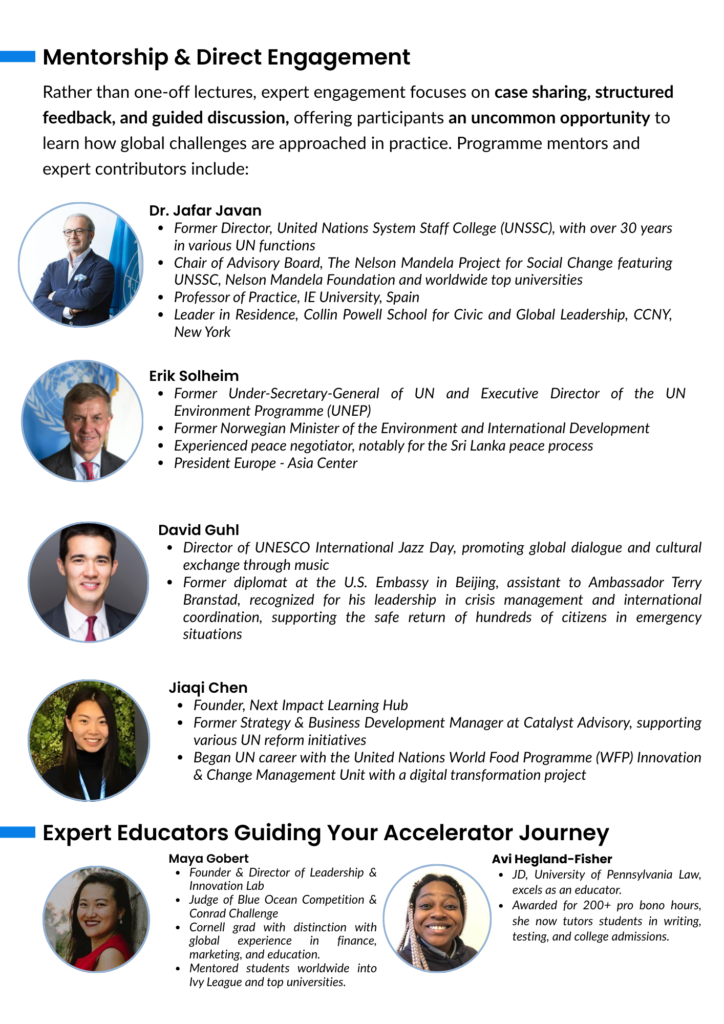 Grounded in real-world development challenges and designed to support the UN SDGs, the programme bridges learning and practice – progressing from conceptual frameworks to applied problem-solving, collaboration, and leadership in action. Developed and delivered by Next Impact Learning Hub in collaboration with education partners and experienced practitioners, participants engage directly with senior leaders – including Dr. Jafar Javan (former Director of the United Nations System Staff College and Chair of Next Impact), Erik Solheim (former UN Under-Secretary-General and Executive Director of UNEP), and David Guhl (U.S. diplomat and Director of UNESCO International Jazz Day) – gaining first-hand perspectives on leadership, diplomacy, and decision-making in global contexts.